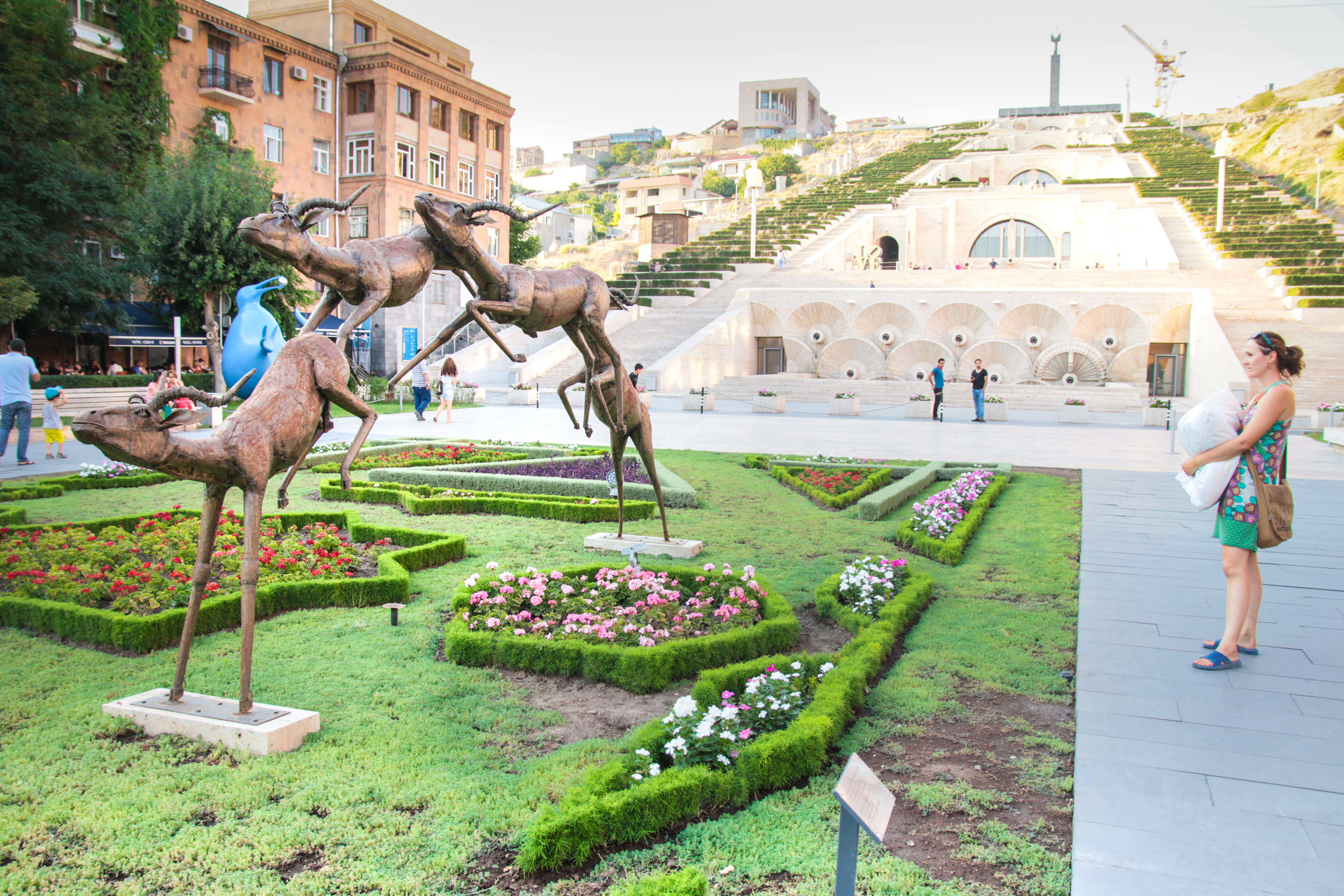 zrieť J. Žiaľ eskalátor a ani kaskády ešte nie sú dokončené a ak chceme dosiahnuť až pamätník úplne navrchu, je potrebné opäť zobudiť sladko spiace svalstvo. Zhora je nádherný výhľad na celé mesto a v prípade dobrého počasia aj na vrch Ararat s jeho zasneženou čiapočkou. Cestou späť sa zastavíme ešte pri labuťom jazere, ale keďže labute na ňom nie sú, nezdržíme sa a ideme radšej do pripravených spacákov.